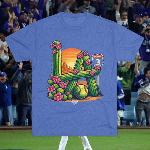 This original illustration features desert cacti shaped to form the letters “L” and “A,” inspired by the energy of springtime baseball in the Arizona desert. Blooming pink desert flowers bring the landscape to life, while a round barrel cactus styled like a stitched ball nods subtly to the game. A vintage-style “Highway 3” sign in the background hints at the journey ahead — symbolizing that the road to the next championship begins here. Designed for fans who understand that winning starts long before Opening Day.